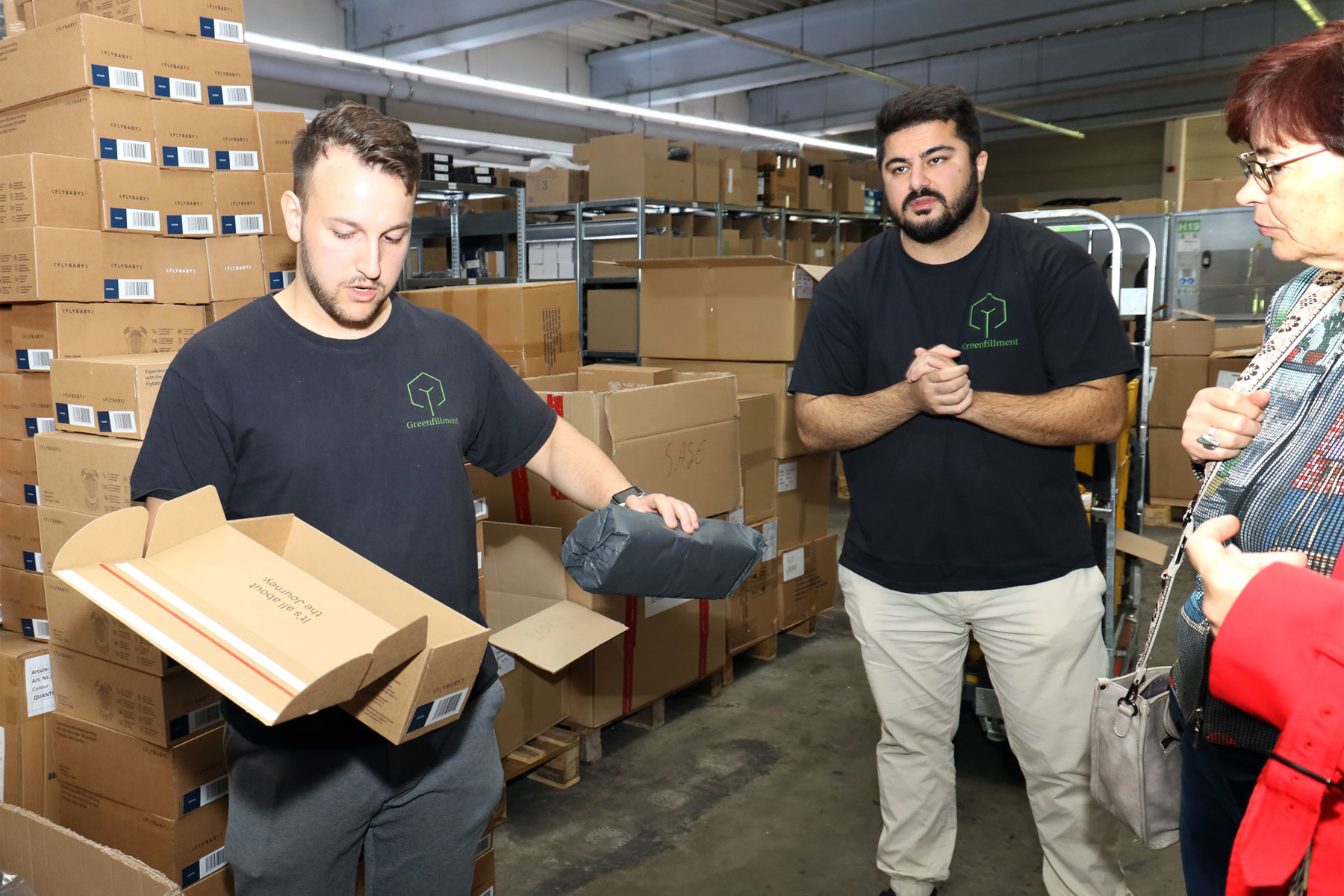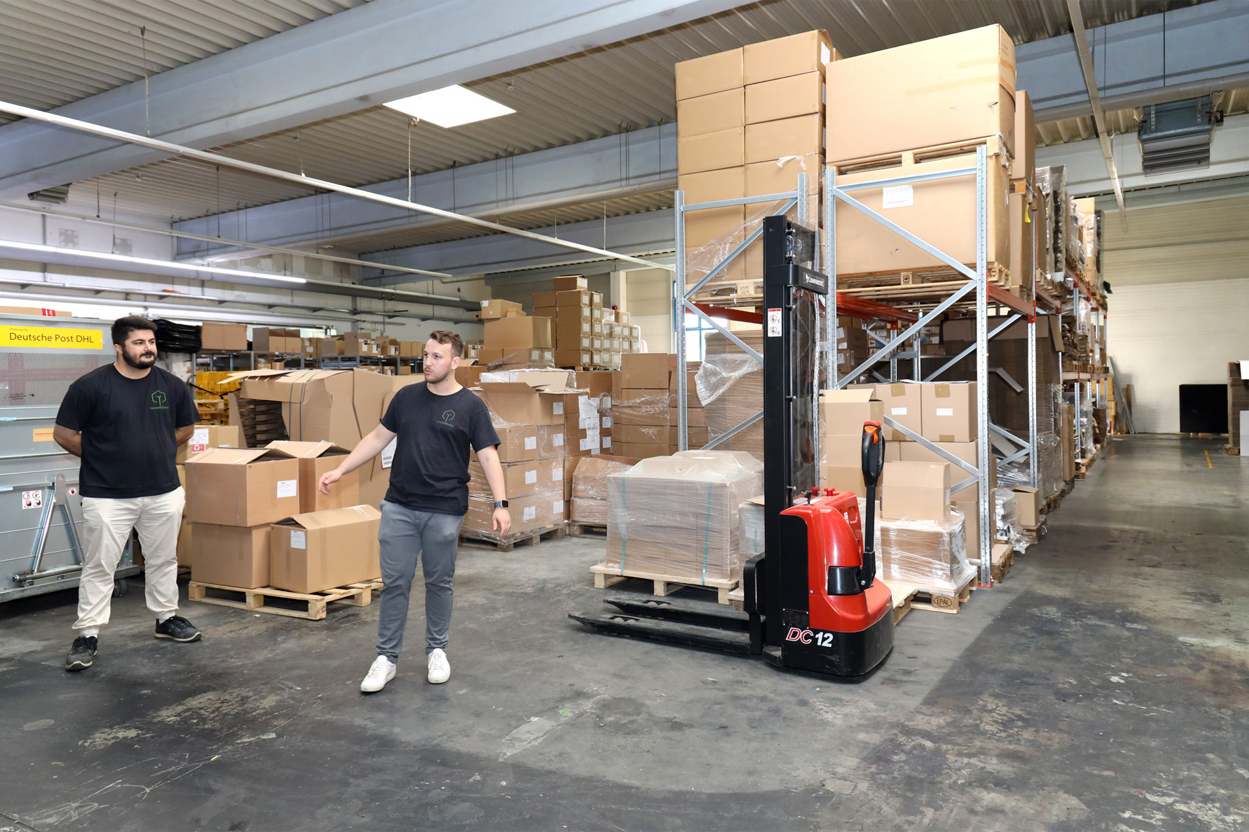 Die Greenfillment GmbH setzt auf Nachhaltigkeit und Kontinuität, deshalb gibt es kaum besondere Spitzenzeiten wie beim „Black Friday“ oder ähnlichen Aktionen, sagt Nicolas Bostans Vater Andreas Bostan, der als Gesellschafter mit im Boot ist. In der Halle gibt es keinen Fahrzeugverkehr, die größten Geräte sind Hubwagen. Ansonsten wird das Bild bestimmt von Palettenregalen, Kommissionier-Bereichen und mit Computern ausgestatteten Packtischen.